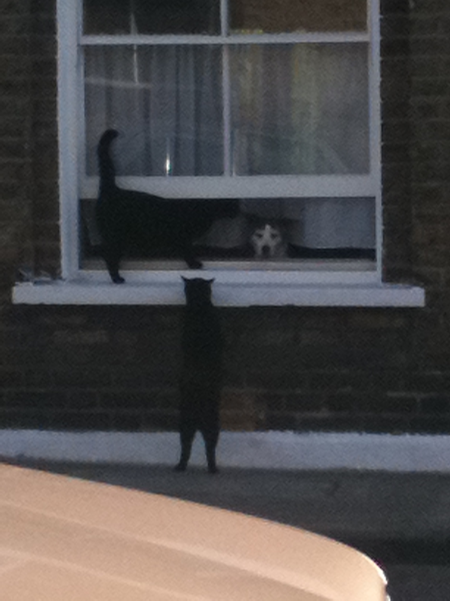 The forbearance the cats showed our intruder is less remarkable than it might be, because in true Bethnal Green style, they have become mates with the neighbouring dog. Grouped at the windowsill opposite they commune happily, startling passers-by.
